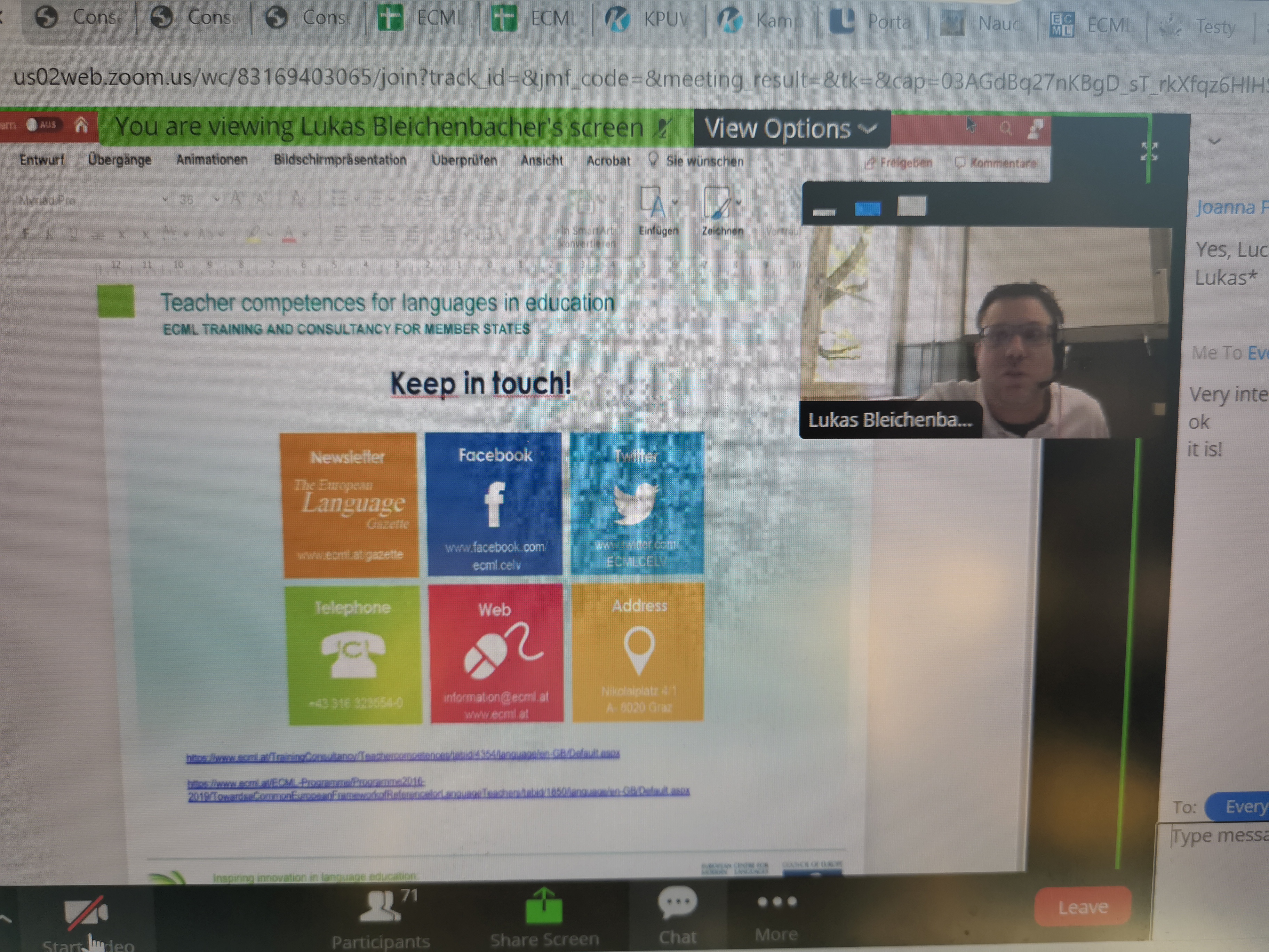 Wydarzenie typu Training and Consultancy z ramienia ECML, którego nadrzędnym celem było otwarcie projektu ECML (Kompetencje nauczyciela w zakresie języków w edukacji) na szersze grono odbiorców, obfitowało w inspirujące i innowacyjne zagadnienia – takie jak inne warsztaty, konferencje, zasoby i strona instytucji z Grazu. Udział w tych wydarzeniach to zawsze przyjemność, przywilej i satysfakcja, która przynosi namacalne korzyści lokalnym społecznościom. Dzięki inspiracjom płynącym z ECML byliśmy gotowi otworzyć się na całkiem nowe idee w edukacji oraz nowe środowiska, na współpracę w ramach innych przedmiotów niż język obcy oraz ze społecznością języka migowego. Użytkownicy tego języka do tej pory funkcjonowali na obrzeżach edukacji i kształcenia nauczycieli. Nadszedł jednak czas, aby zmienić ten paradygmat i rozpocząć jakże potrzebną współpracę dla korzyści wszystkich uczących się oraz społeczeństw. Eksperckie wsparcie ECML i praca zaangażowanych i inspirujących członków zespołu projektowego to duży krok w tym potrzebnym kierunku.